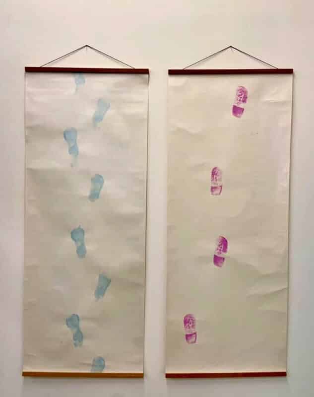 By enjoying a fun session on their therapy pony, children are doing physio without knowing it! A simple method is used to measure improvement in walking gait. At the start of an 8-week block of sessions, the participants are asked to walk through paint and walk along on a roll of wallpaper liner. They then do this again at the end of the 8 weeks. The photo shows the clear improvement in walking gait; the blue prints on the left are pre-session with an obvious foot drag, and the right pink footprints are after the end of the sessions, showing a much more confident, drag-free walking pattern.